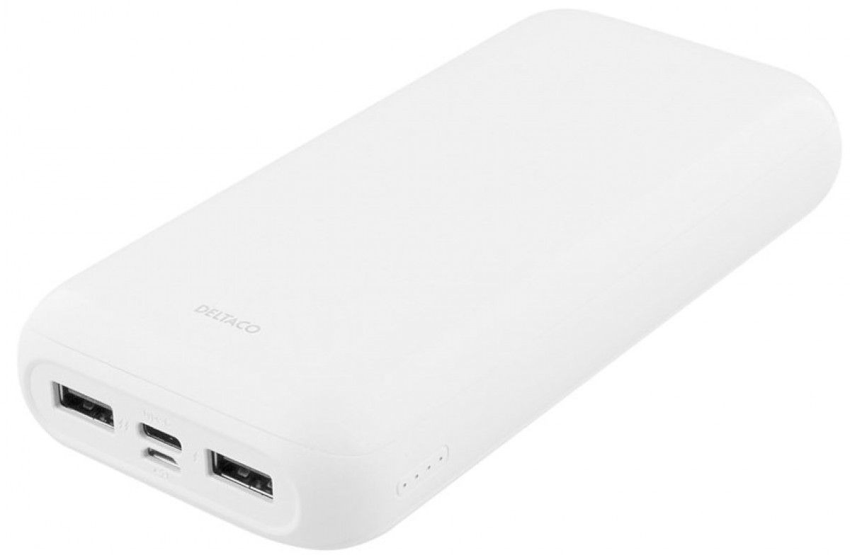 DELTACO varavirtalähde, 20 000 mAh, USB-C, 2 x USB-A, 2,1 A, LED-merkkivalo, valkoinen