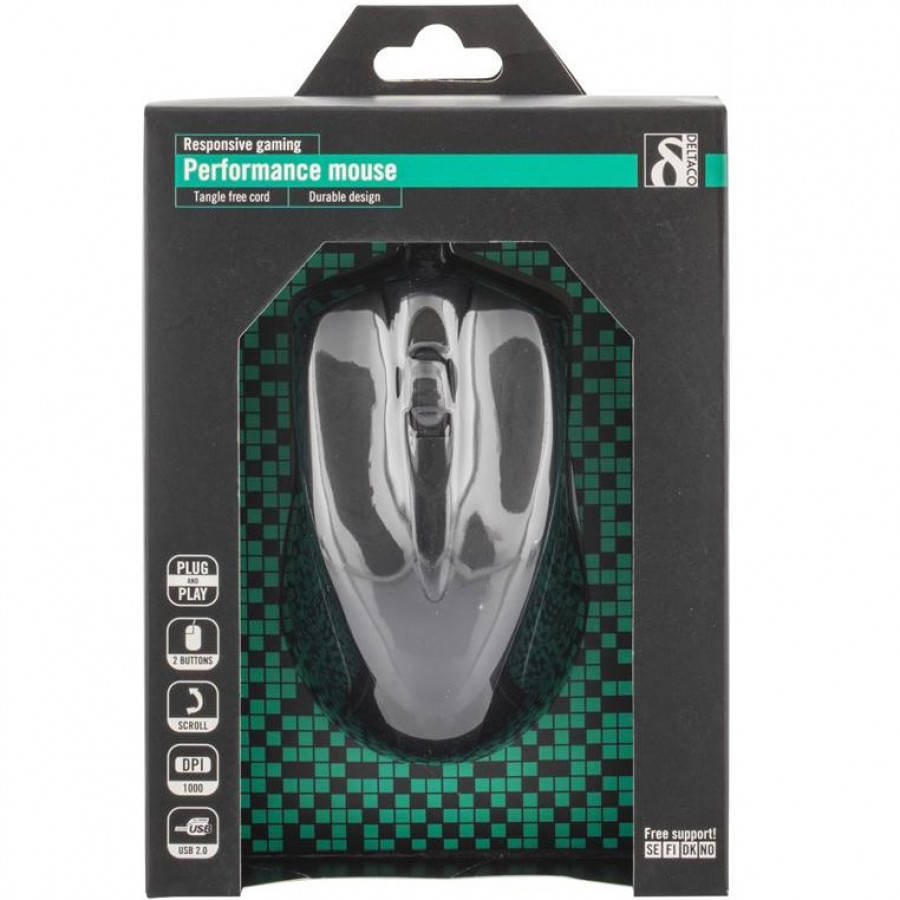 DELTACO optinen pelihiiri, 3 painiketta + rulla, 1000 DPI, USB, 1,4m kaapeli, musta