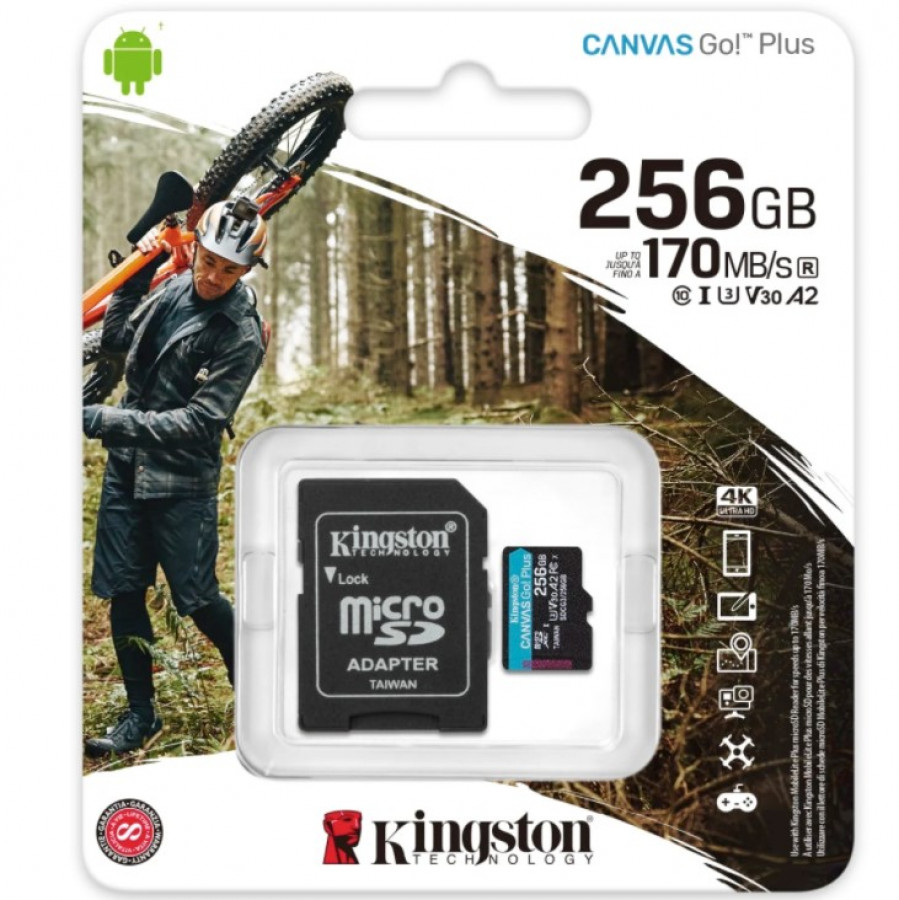 KINGSTON 256GB microSDXC, jopa 170 MB/s nopeus, Canvas Go Plus 170R W90 A2 U3 V30 Card + ADP