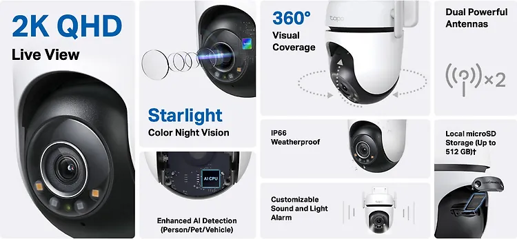 TP-LINK Tapo C520WS on ulkokäyttöön tarkoitettu valvontakamera IP66-luokituksella ja 2K QHD tarkkuudella. Kamerassa on älykäs AI-tunnistus sekä moottoroitu runko, jonka ansiosta se pystyy automaattisesti seuraamaan kohdetta ja näyttämään täyden 360 asteen näkymän. Kamera voidaan liittää kodin langattomaan 2.4 GHz:n Wi-Fi-verkkoon tai kytkeä perinteisesti verkkokaapelilla.