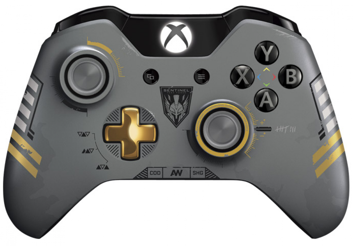- The Xbox One Limited Edition Call of Duty: Advanced Warfare Gamepad is a unique controller based off of the CoD series. This controller features a gray and gold color scheme. Numerous graphics are etched onto the controller, all taken from "Call of Duty: Advanced Warfare." Both the icons and the color scheme are inspired by the in-game Sentinel Task Force military group. The controller is resistant to sweat, meaning the decals won't fade off during intense play. The metallic gold directional pad helps add a splash of color to this Xbox One controller. This wireless device is compatible with all Xbox One gaming consoles. While it features a Call of Duty theme, you can use this themed accessory with all video games on the Xbox One console. The built-in Bluetooth functionality lets you use this device with Windows 10 PCs as well. The Impulse Triggers on the back of this Xbox device are more responsive than typical triggers. Since the rubber on each thumbstick is durable, you'll be able to use this controller for a long time. The directional pad is also extremely precise. This Xbox One accessory features the same comfortable design as previous Xbox controllers. It will fit both small and large hands perfectly. The ergonomic design ensures that even after hours of gameplay, your hands won't cramp. The port at the bottom of the device allows you to attach a headset. Players can then use this headset to chat with friends in multiplayer games. You can attach a pair of headphones to this port as well. The force feedback vibration function on this controller allows you to feel like you're part of the action. Whenever an explosion occurs on the screen, you'll feel it on your device, which has twice the wireless range of the controllers found on the Xbox 360. This extended range lets you sit further from the television when gaming. The stronger wireless technology also ensures that your controller won't disconnect when you're playing a game.